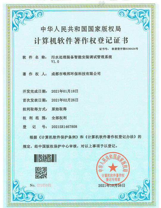 低耗能農村污水處理設備-證書